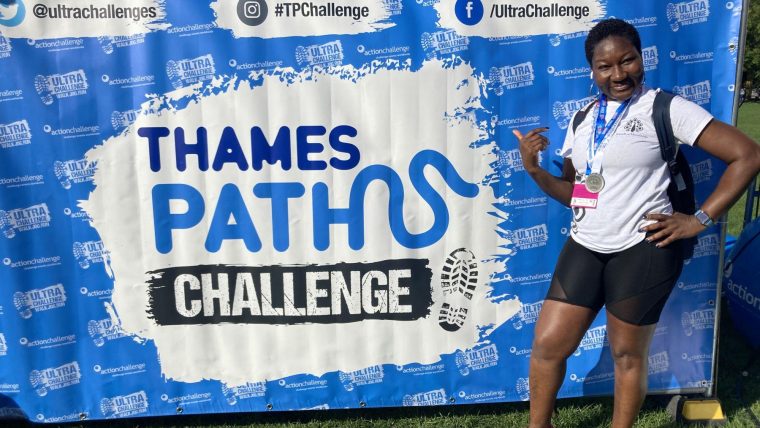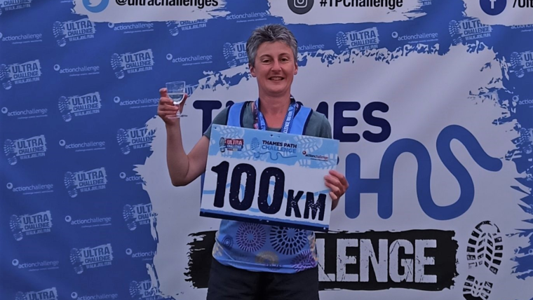 Yvonne Gailey after completing the 100km Thames Path Challenge for Moorfields